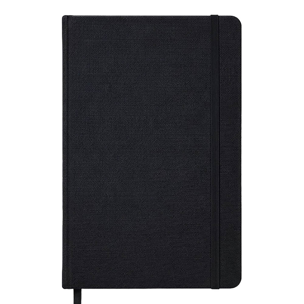 Cuaderno con tapa rígida de R-PET. Banda elástica de cierre y marcapáginas de cinta de satén