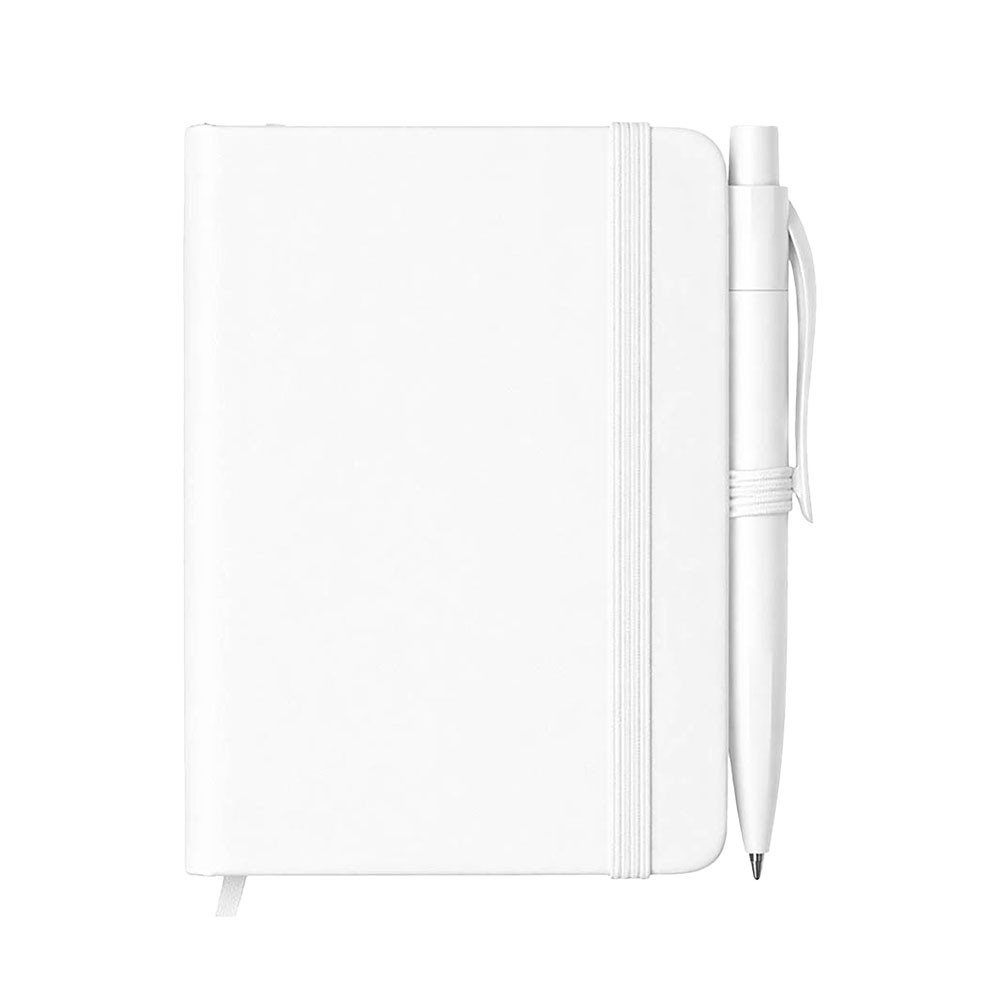 Set de cuaderno con cubierta rigida en PU y mini boligrafo. Cierre elastico marcapaginas de saten y caja