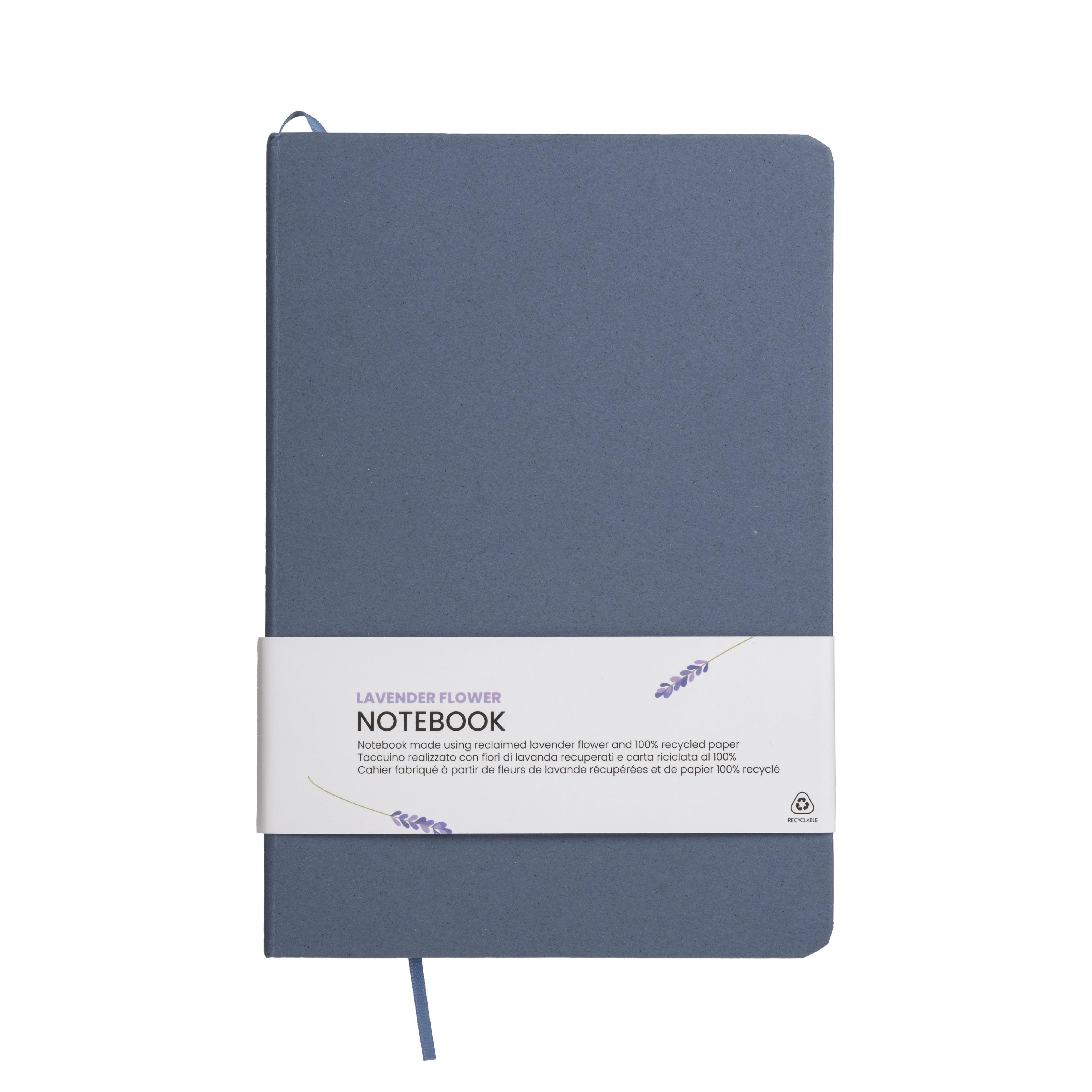 Cuaderno con cubierta de residuos de granos de café, cereza, lavanda, limón, maíz y kiwi. Hojas a rayas en papel reciclado marfil (80 páginas), cierre elástico y marcapáginas de raso a juego