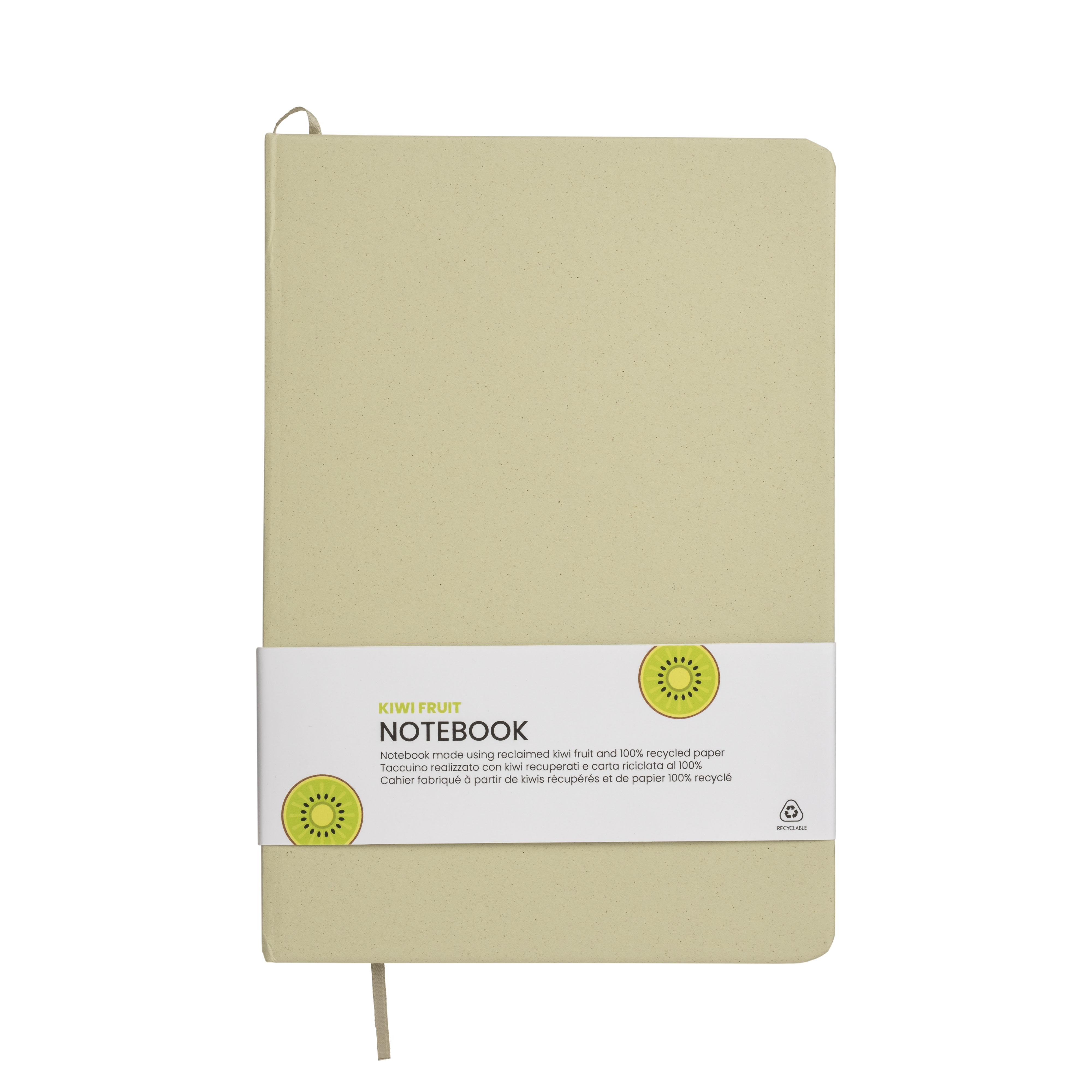 Cuaderno con cubierta de residuos de granos de café, cereza, lavanda, limón, maíz y kiwi. Hojas a rayas en papel reciclado marfil (80 páginas), cierre elástico y marcapáginas de raso a juego