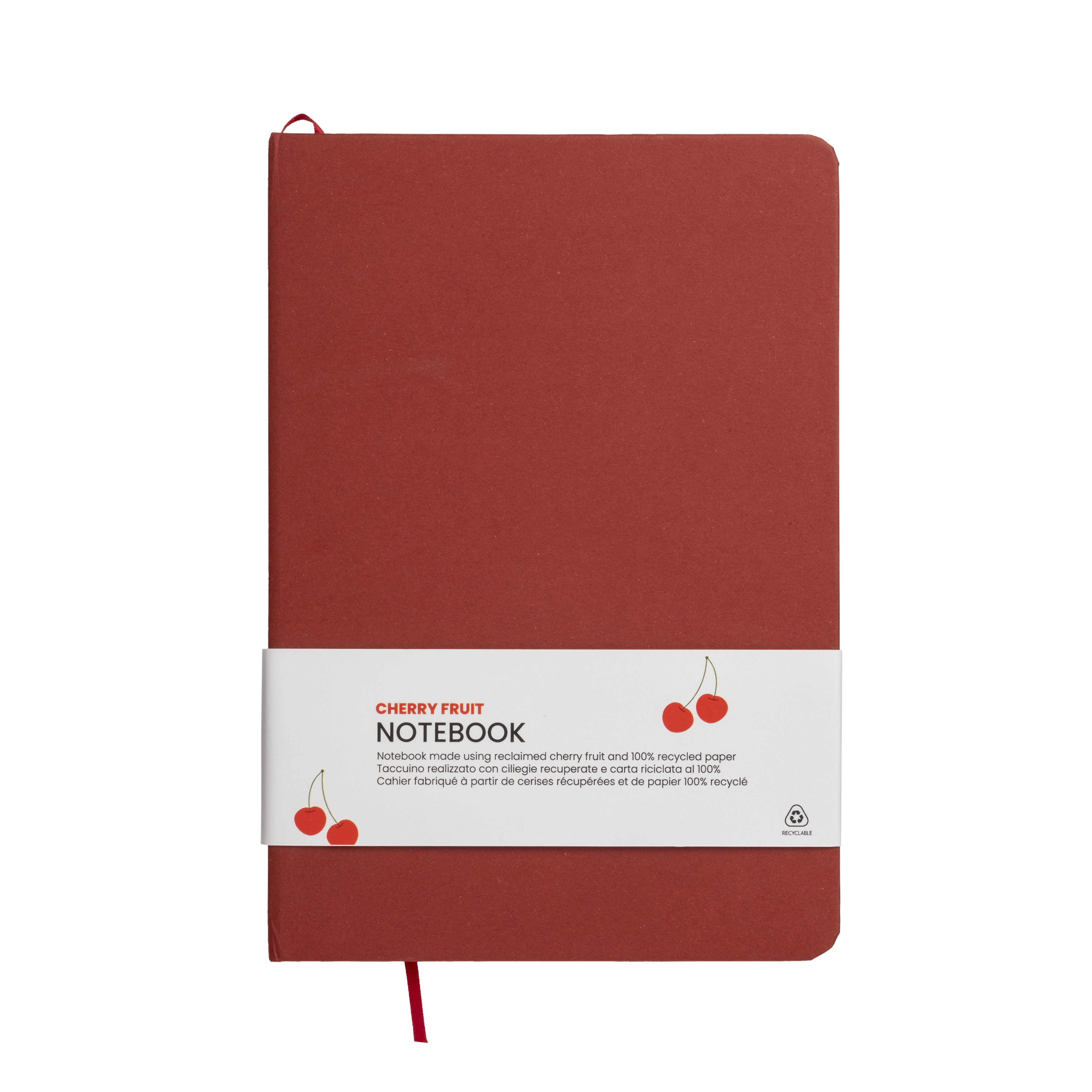 Cuaderno con cubierta de residuos de granos de café, cereza, lavanda, limón, maíz y kiwi. Hojas a rayas en papel reciclado marfil (80 páginas), cierre elástico y marcapáginas de raso a juego