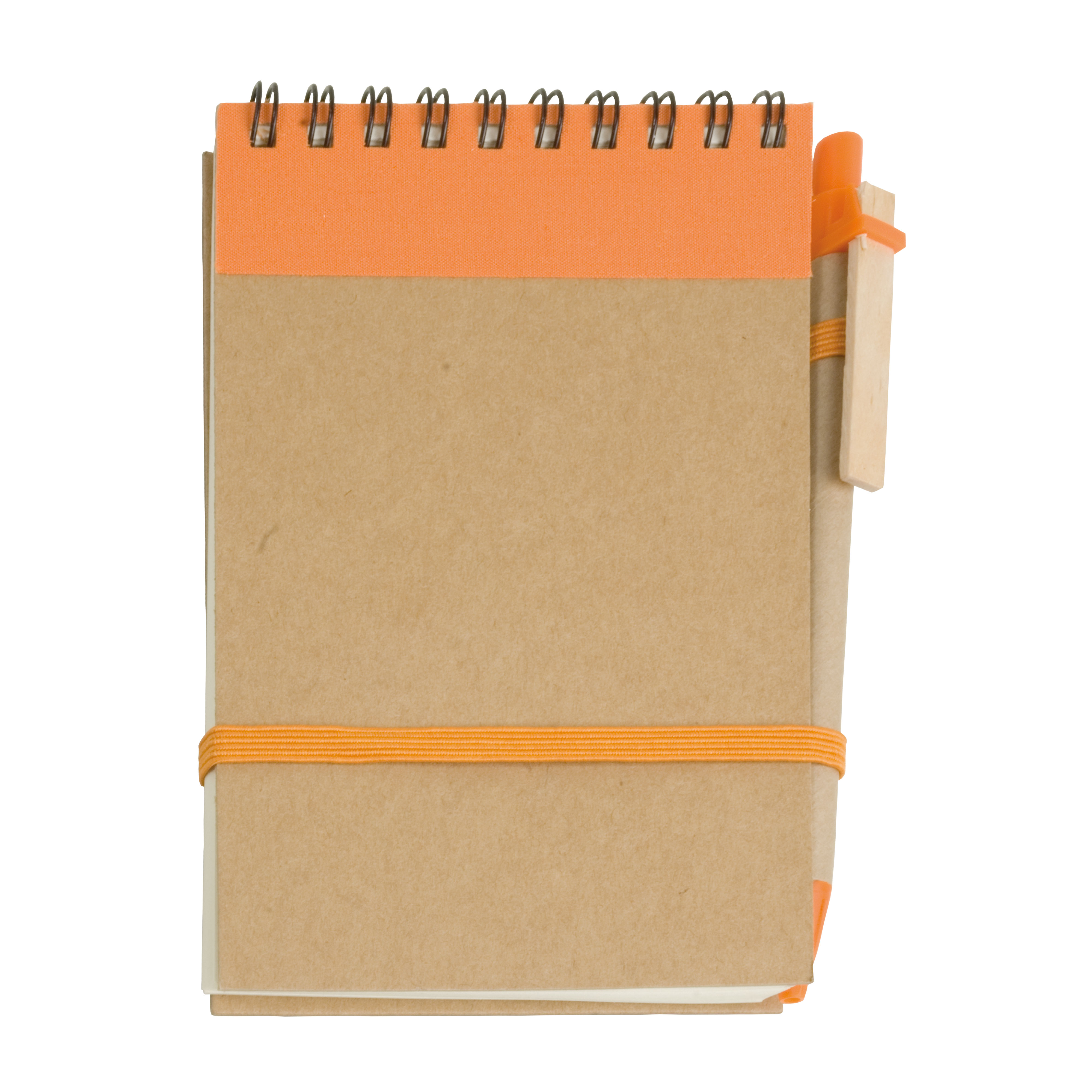 Bloc de notas con tapas de cartón reciclado con bolígrafo con escritura azul y cierre con goma elástica. Medidas 9 x 14,8 cm.