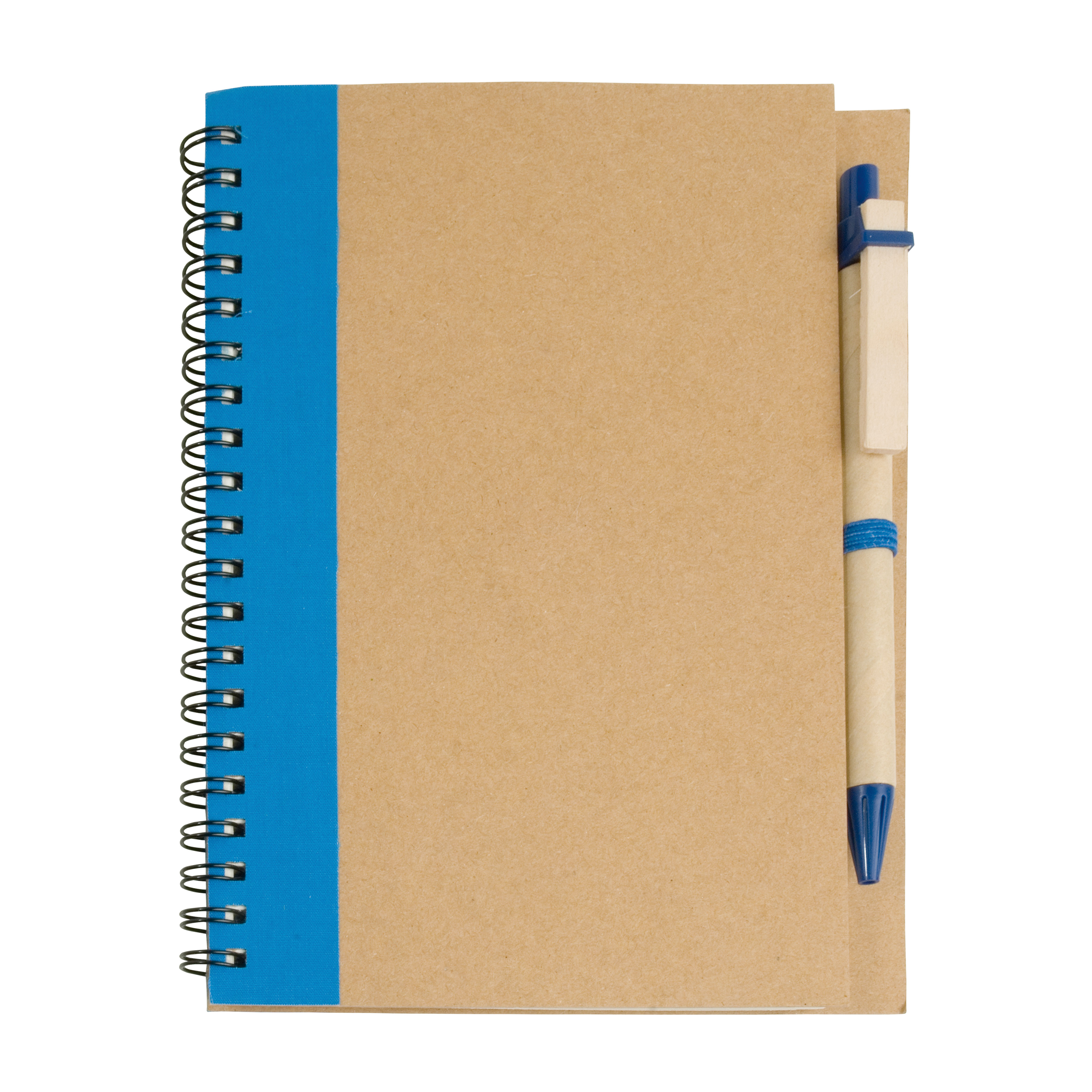 Libreta con tapas de cartón reciclado, 70 hojas, sujetaboligrafo y bolígrafo con escritura azul.