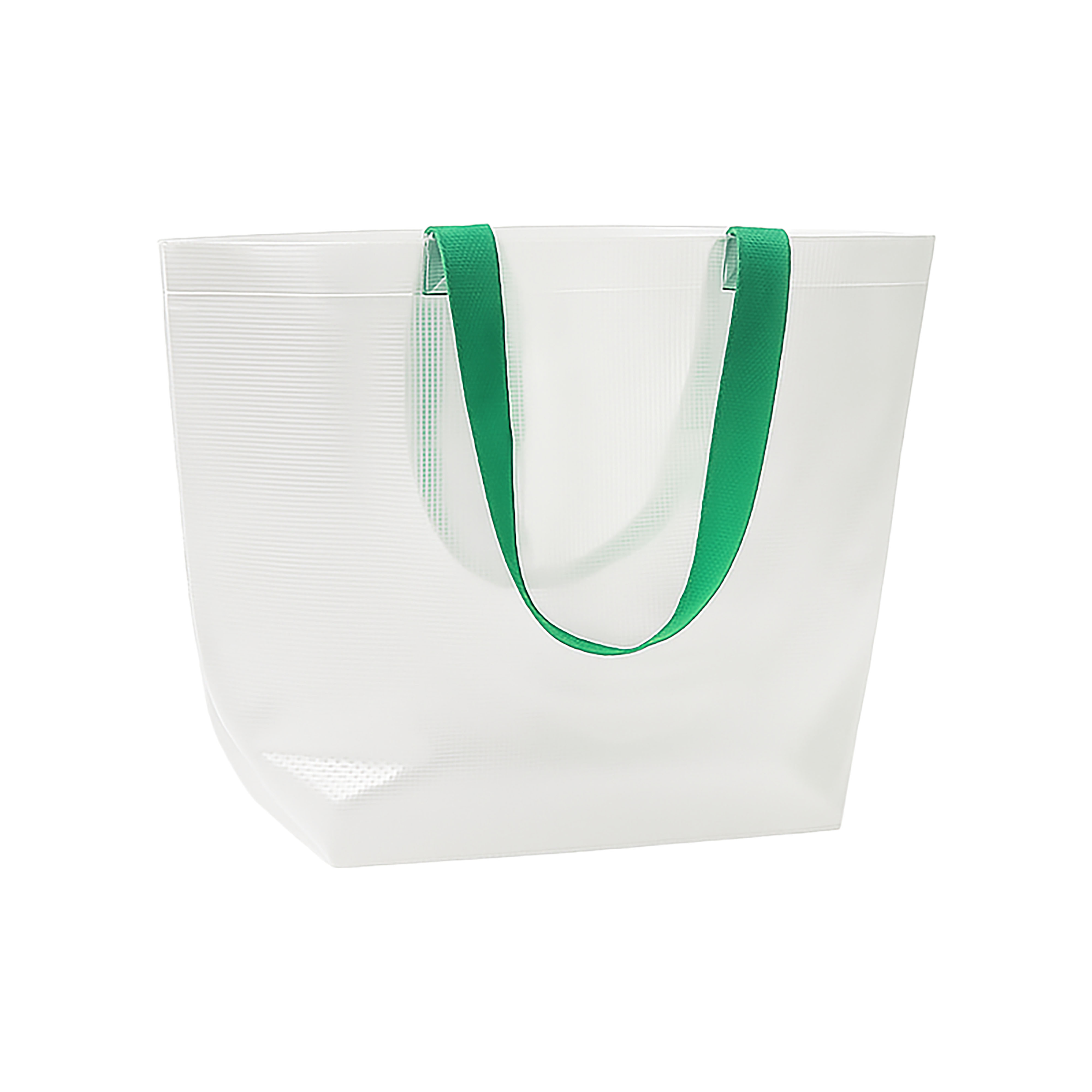 Bolsa shopper transparente en PP laminado 110 g/m2. Asas largas de poliester de color y fuelle