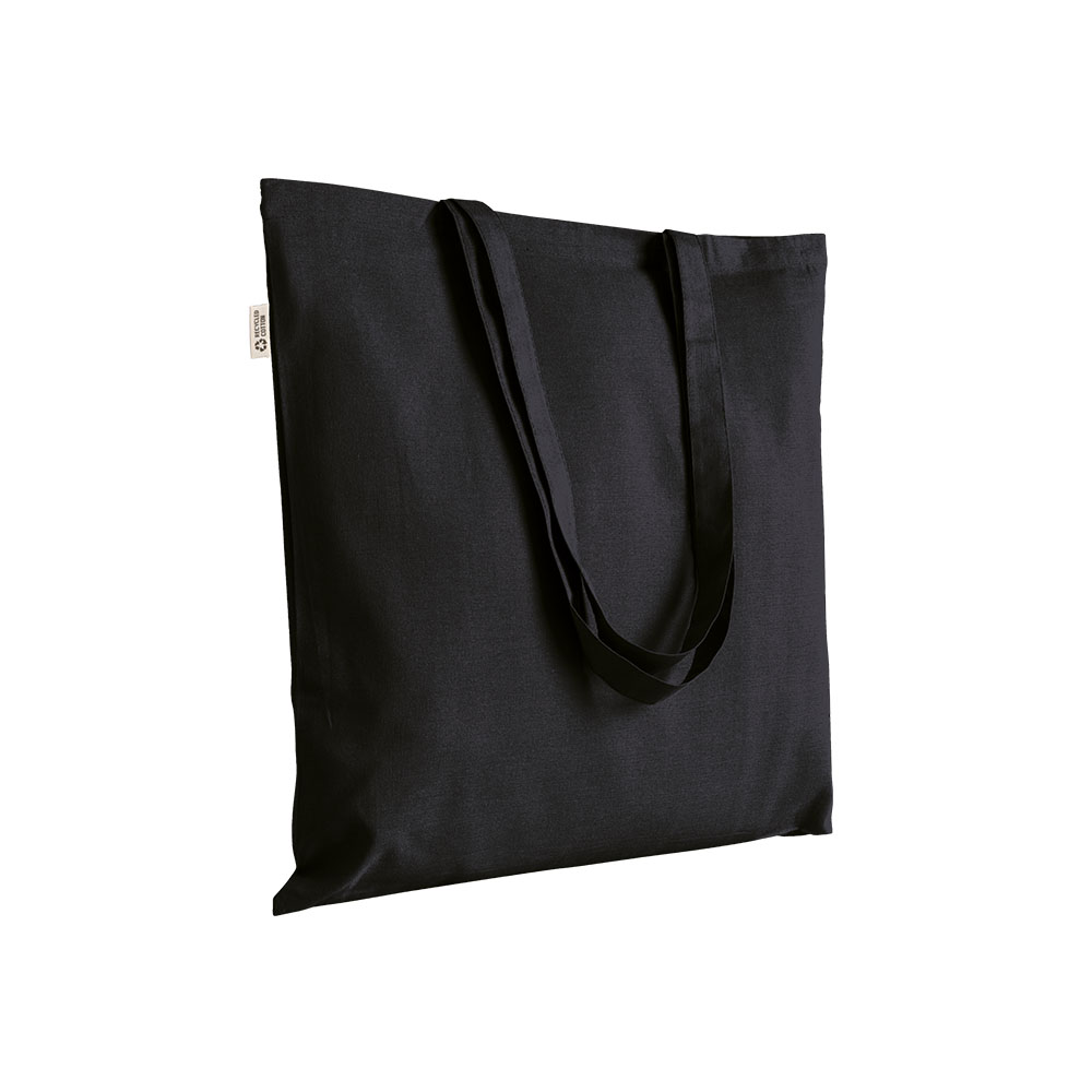 Bolsa shopper de color liso en algodón reciclado de 140 g/m2. Equipada con asas largas para llevarla cómodamente en la mano o en el hombro. Cuenta con la certificación GRS (Global Recycled Standard)