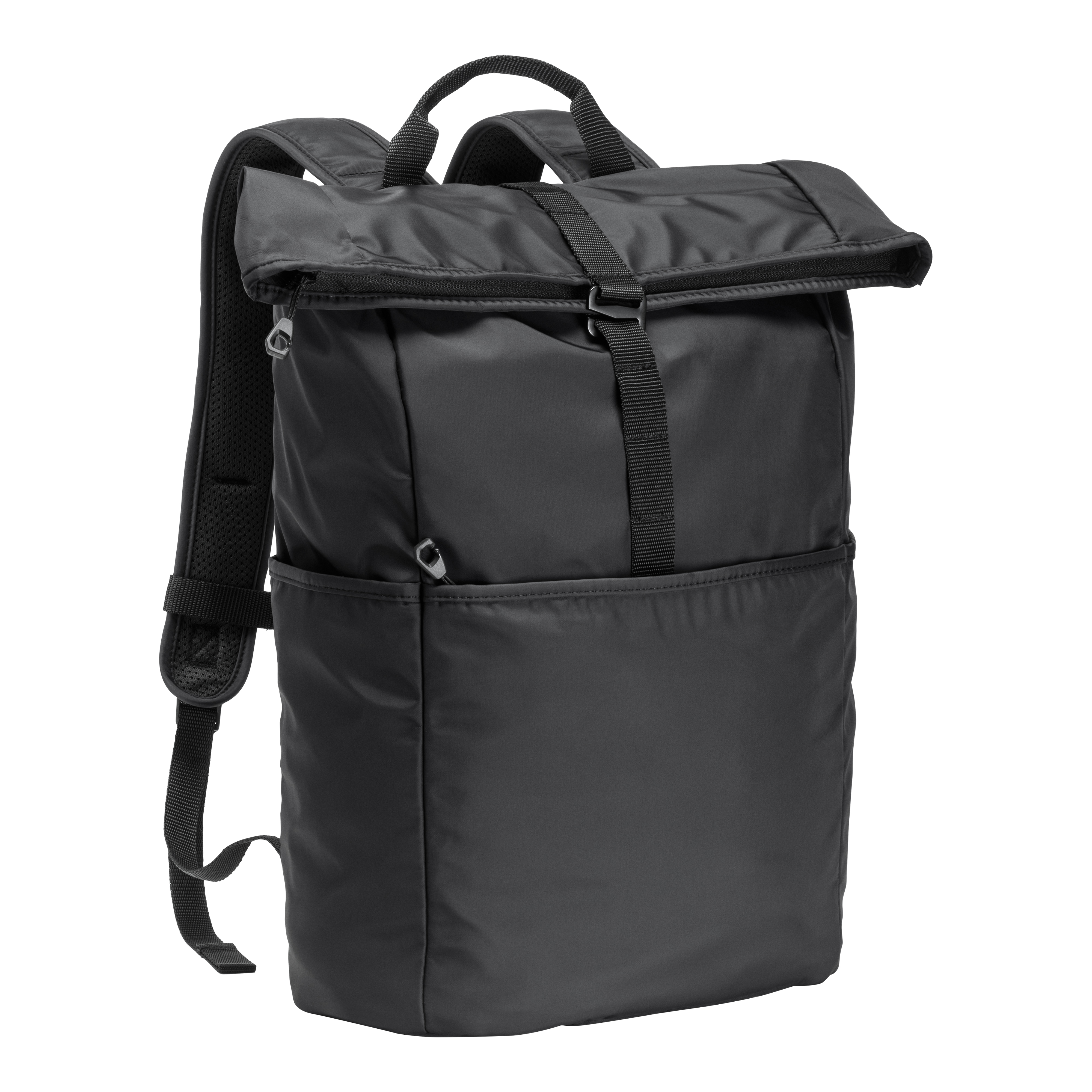 Mochila plegable para portátil (15) fabricada en nailon 310T. Esta mochila se enrolla sobre sí misma para resultar compacta y fácil de transportar. Gran compartimento principal con cierre de gancho metálico. Bolsillo frontal con cremallera y 2 bolsillos laterales. Espalda y hombreras acolchadas con material transpirabl