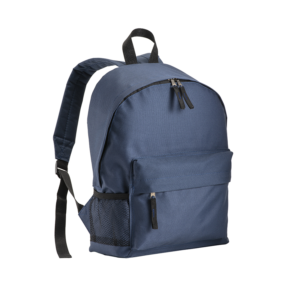 Mochila con bolsillo frontal con cierre cremallera, bolsillo lateral de red, asas acolchadas, respaldo acolchado y cinta para colgar