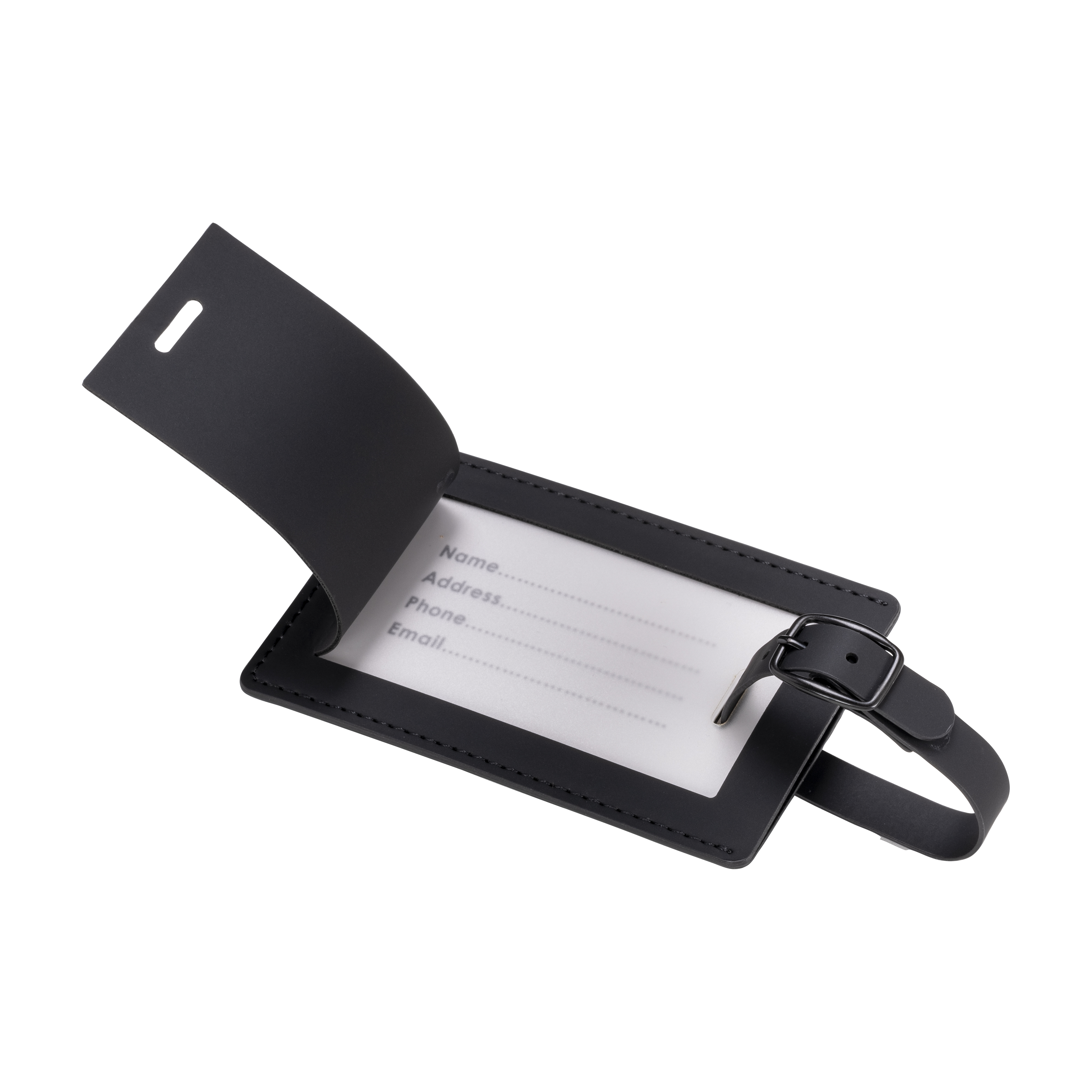 • Etiqueta de equipaje de PU blando. Con tarjeta interior para nombre y datos de contacto