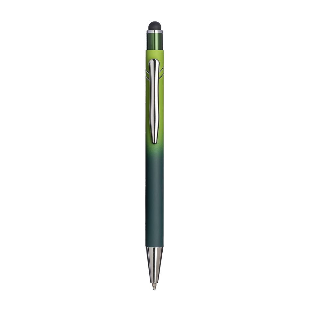 Boligrafo con pulsador de aluminio engomado. Cuerpo degradado, clip y detalles metalizados