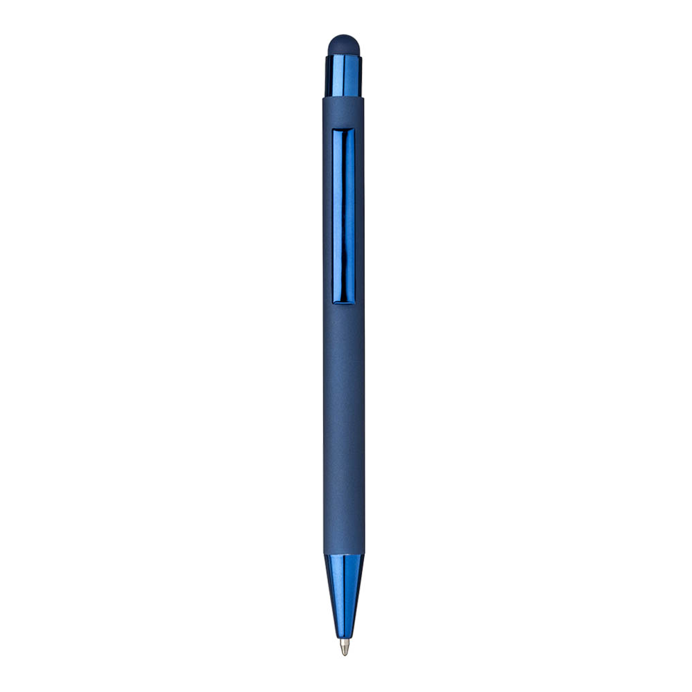 Boligrafo con pulsador de aluminio engomado. Clip y detalles metalizados a juego