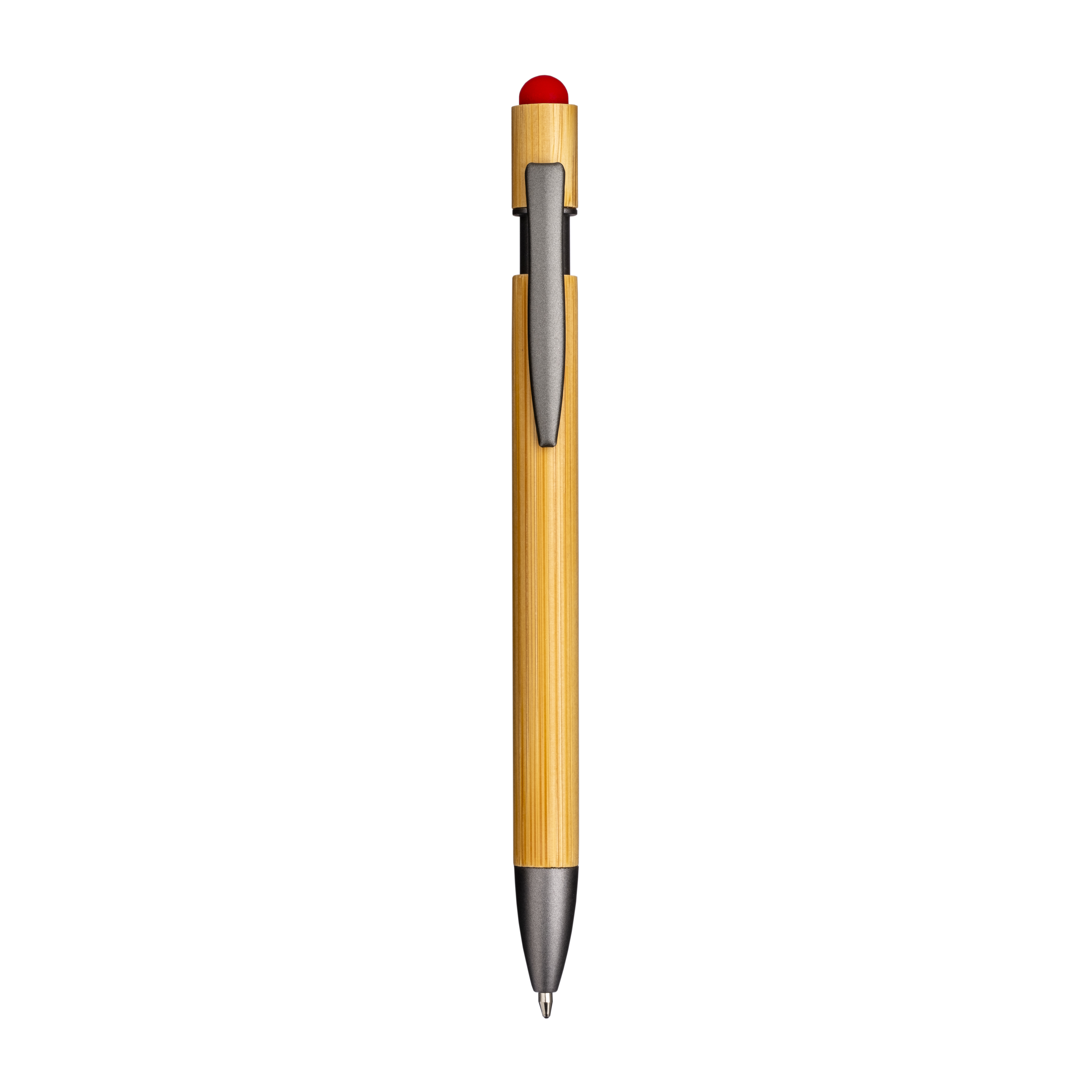 Bolígrafo click de bambú y metal. Detalles bruñidos y goma de borrar táctil.