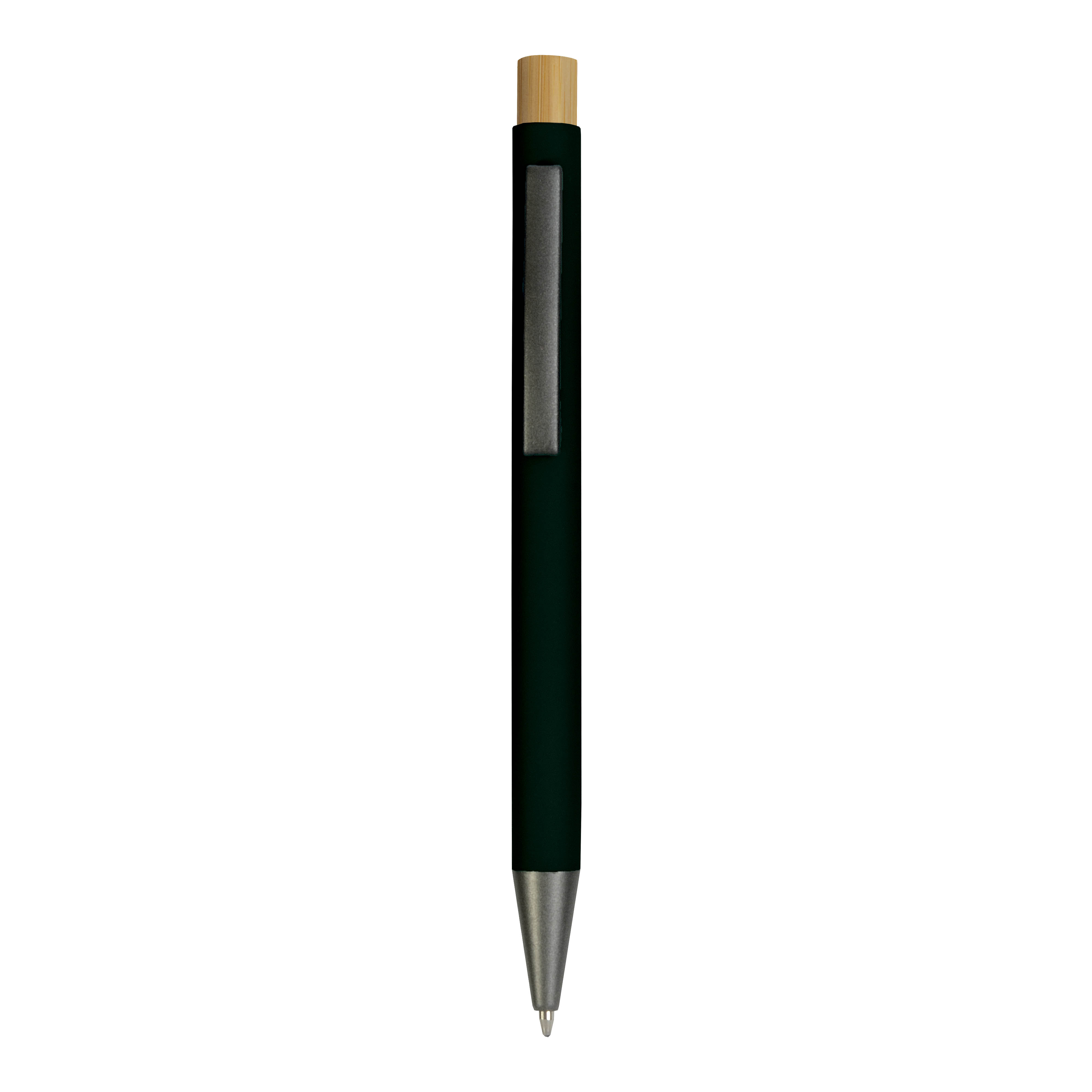 Bolígrafo pulsador de metal engomado con detalles bruñidos y botón de bambú