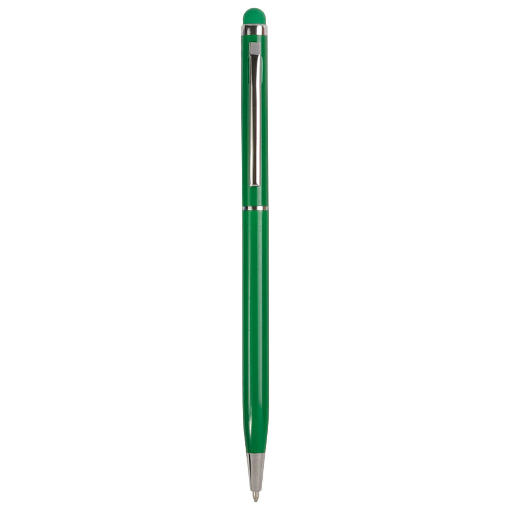 Bolígrafo de metal con mecanismo de giro y puntero para pantallas táctiles. Escritura negra.