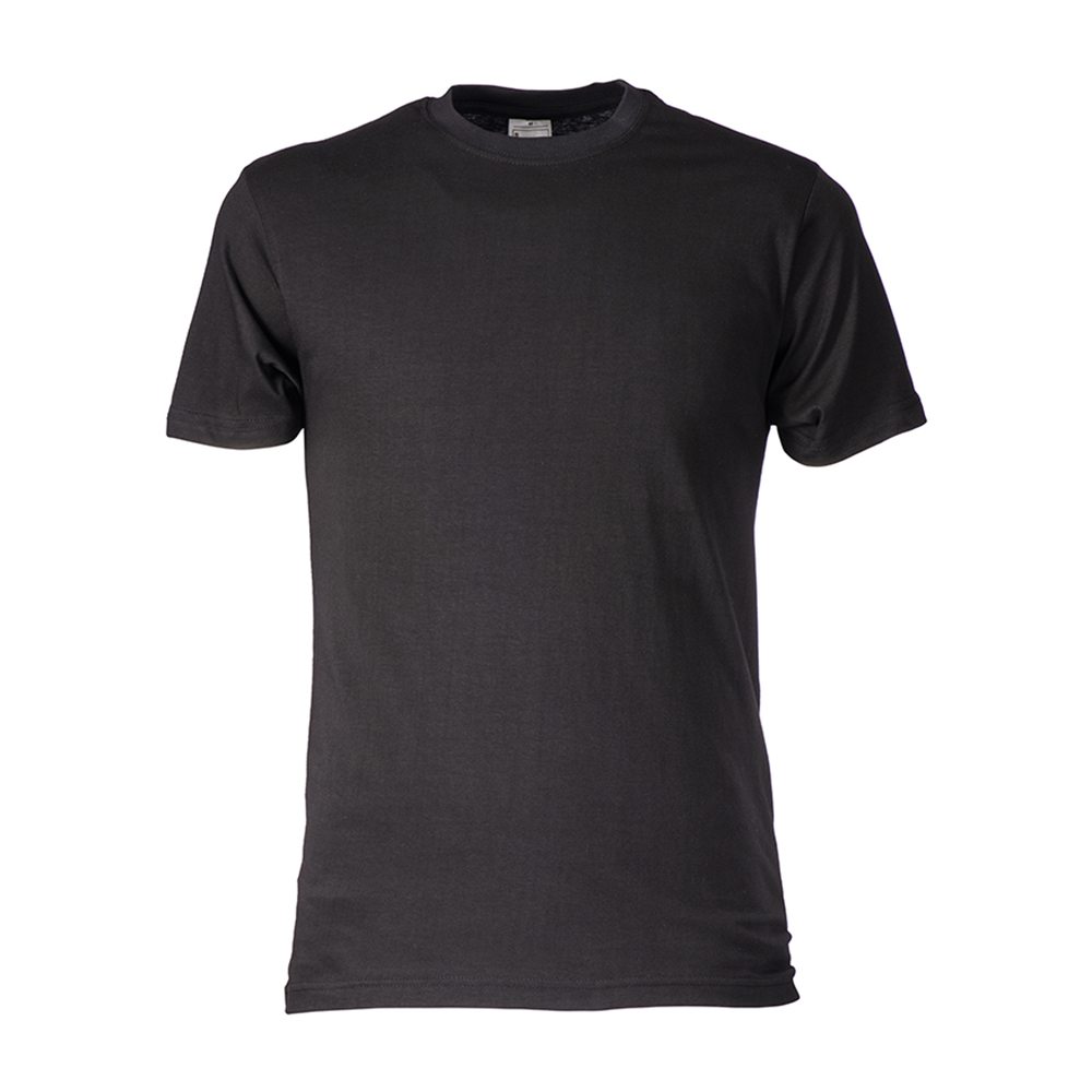 Jersey sencillo 100 % algodón hilado en anillos. Camiseta tubular unisex de manga corta, cuello acanalado de doble capa con doble costura y cinta de cuello reforzada, 145 g/m2