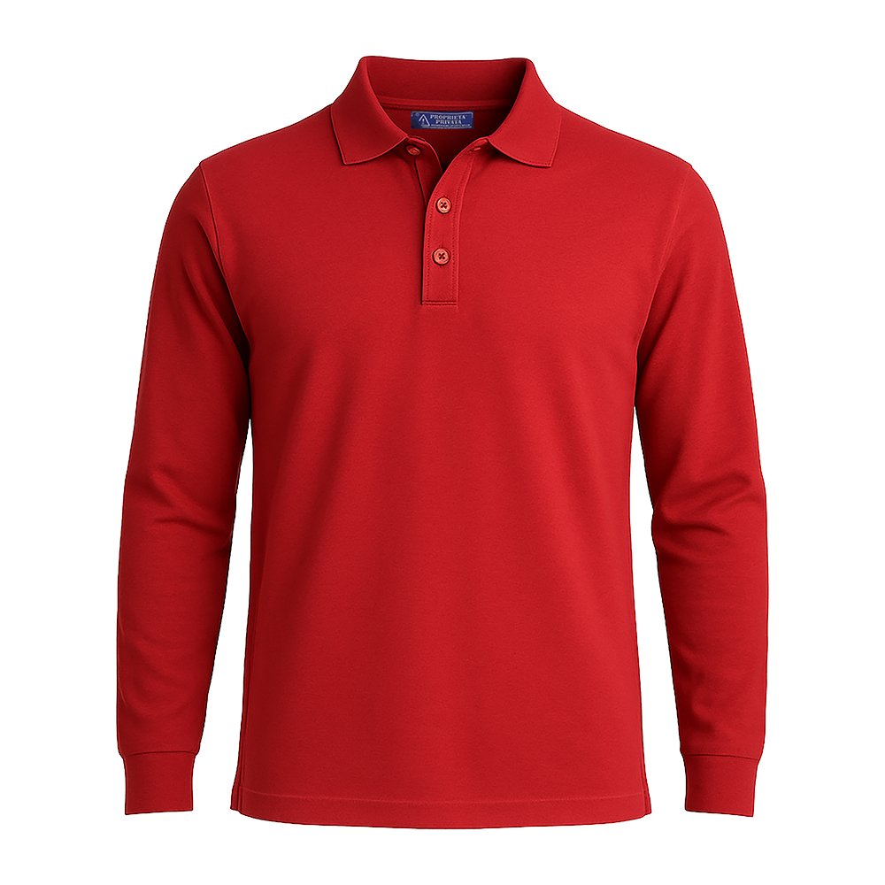 Polo piqué de algodón 180 gr/m² con tapeta de 3 botones y manga larga. Tallas S-M-L-XL-XXL.