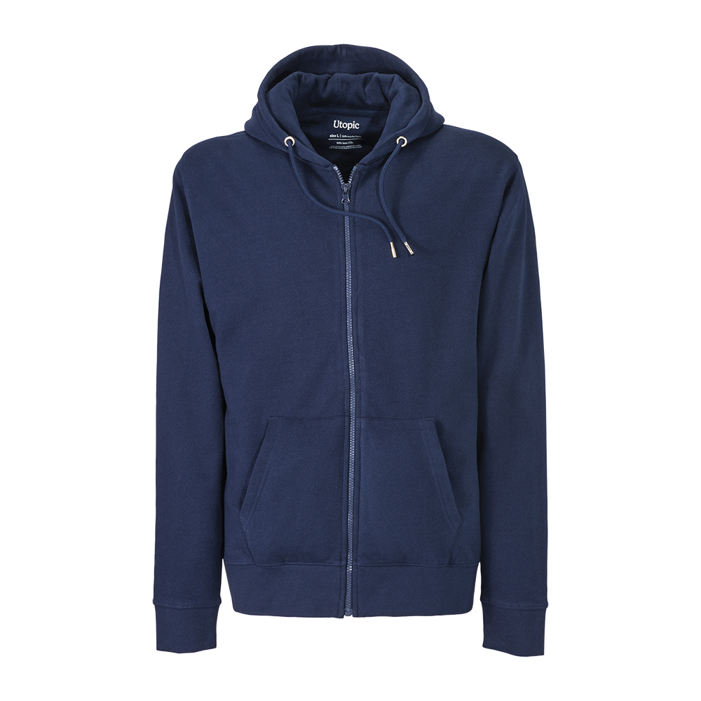 Tejido 100% regenerado. Sudadera unisex con capucha y cremallera, interior de forro polar. Capucha de doble capa, ojales metálicos, cordones con puntas metálicas, bolsillo grande, puños y bajo de canalé, costuras laterales