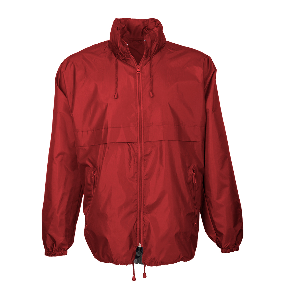 Chubasquero cortavientos de poliéster 190T con capucha extraíble del bolsillo del cuello. Transformable en bolsa con cinturón. Tallas S-M-L-XL.